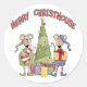 Two cute holiday mice, one holding a candy cane and one holding a present standing in front of a Christmas Tree with the text 'Merry Christmouse'.