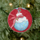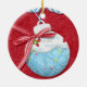 A beautiful round tree ornament of blue and white with a red checked bow on a Merry Christmouse ornament.