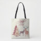 This rustic country Christmas tote bag has three Christmas trees in plaid, polka dots, and snowflakes patterns in muted shades of burgundy, tan, and green with stars on top of two of the trees. There are also two plaid standing deer in a matching colour scheme. The buck has dusty blue-grey antlers. In between the images is modern calligraphy type lettering that says "Merry Christmas" that you can delete if you don't want it.