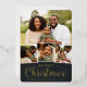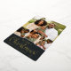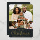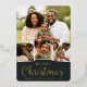 Festive holiday photo card features four of your favourite images arranged in a collage layout. "Merry Christmas" appears beneath in gold foil lettering, along with your names and the year, on a rich charcoal black background.