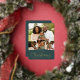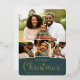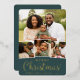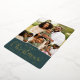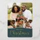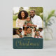Festive holiday photo card features four of your favourite images arranged in a collage layout. "Merry Christmas" appears beneath in gold foil lettering, along with your names and the year, on a dark forest green background.