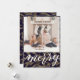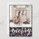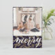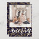 Send customisable and personalised holiday greetings to friends, colleagues and family in simple, chic, elegant and modern photo design festive, natural minimalist style cards! A beautiful calligraphy of " merry " frames on bottom of your photo in front. Below the calligraphy features your custom greeting message from your family name in modern typography. Reverse to reveal a beautiful golden Christmas tree boughs in dark navy blue background.