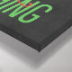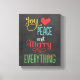 Colourful and modern custom holiday canvas art design features the phrase "Joy, Love, Peace and Merry Everything" in bold colours and modern type on a black chalkboard style background.