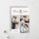 A stylish three photo holiday card design, featuring watercolor painted mistletoe and elegant text, reading, "Merry Kisses." Perfect for the newlywed couple! The back features a pine and snowflakes pattern in white over a custom colour background.