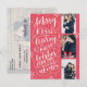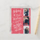 This modern and chic holiday photo postcard doubles as a save the date card for the newly engaged couple. The front features 3 of your photos accented by hand drawn snowflakes and hand lettered typography that says "Merry Kisses and Warm Holiday Wishes From The Soon To Be Mr. and Mrs." on a Red background. The back features a full photo with a transparent white overlay with your save the date details, address and custom message.