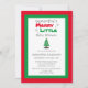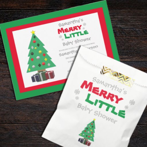 Christmas themed merry little baby shower invitations. Invite features red and green holiday theme with grey snowflakes, Christmas tree and presents