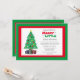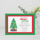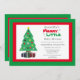 Christmas themed merry little baby shower invitation. Invite features red and green holiday theme with grey snowflakes, Christmas tree and presents.