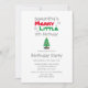 Kids Christmas themed merry little birthday invitations. Invite features red and green holiday theme with grey snowflakes, Christmas tree and presents