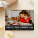 Merry Little Christmas Black Modern Script Photo Holiday Card. Send customisable and personalised holiday greetings to friends, colleagues and family in simple, chic, elegant and modern photo design festive, natural minimalist style cards! Below the calligraphy features your custom greeting message in modern typography.