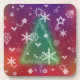 A scattering of white snowflakes, holly leaves and berries, stars, and pine trees against a glowing background of red, orange, gold, and purple, with a soft green Christmas tree shape in the middle.