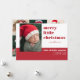 "Merry Little Christmas". This minimal typography Christmas birth announcement highlights your imagery with fresh, modern typefaces. Customise with a photo, and birth stats. Additional 5 photo collage on the back.
