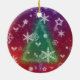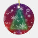 A scattering of white snowflakes, holly leaves and berries, stars, and pine trees against a glowing background of red, orange, gold, and purple, with a soft green Christmas tree shape in the middle.