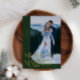 Minimal and elegant holiday card for the newlyweds celebrating their first Christmas together as husband and wife featuring a text that says "Merry and Married" in on top of your photo with a curved corner. The background is green.