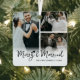 Minimalist newlywed keepsake ornament featuring 3 custom photos of your wedding day, the cute saying 'merry & married', your family name, and the year.