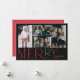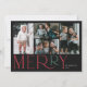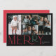 These simple holiday photo greeting cards feature the greeting, “Merry,” in large red and green letters on an black background with placeholders to add four of your favourite photos, family name & the year.