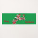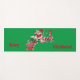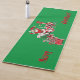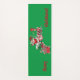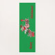 This yoga mat is green with Santa Claus riding a peppermint candy train carrying candy canes, holly, and letters to Santa with the text Merry Christmas in red.