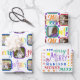Personalised holiday photo wrapping paper is a cute way to bring smiles around the Christmas tree and this MERRY script design assortment in rainbow colours on white is an easy way to create your own. Just fill in the templates by adding your photos and add your child's name (or your last name or MERRY MERRY if you like) to the red, orange, yellow, green, blue and purple typography on white design on Sheet 3 and this custom Christmas wrapping paper is one of a kind, printed just for you. Sheet 1 features two of your photos in a square format with rounded corners bordered in blue and purple, for a retro vintage feel, along with two styles of script and whimsical handwritten fonts with each letter coloured in rainbow hues for the MERRY printed between each photo. Sheet 2 is also designed with square photos with rounded corners and red and green frames, this time in a classic chequerboard pattern with two styles of MERRY script in colourful lettering and tiny purple polka dots as accents in the corners. Sheet 3 is a typography pattern with mixed fonts in rainbow red, orange, yellow, green, blue and purple spelling out MERRY here, there and everywhere and your child's name nestled in between to become a part of the design. This personalised Christmas gift wrap featuring your photos and a colour scheme of rainbow colours on white will be a delight under the tree for all of your friends and family this holiday season.