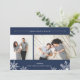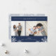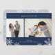 Elegant and modern Hanukkah photo card features two favourite photos aligned side by side, with "Joyous Hanukkah" at the top in white italic and block typography. Personalise with your custom greeting and name at the bottom, accented by four white snowflake illustrations. A navy blue background adds classic elegance to your holiday greeting. Card reverses to a snowfall pattern in chic grey.