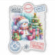 A cheerful snowman wears a cosy hat and scarf, nestled among colourful gifts. Surrounded by playful holiday stickers, it enjoys a warm drink beside a decorated Christmas tree, embodying the spirit of joy and giving during the festive season.