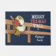 Big bold western style letters wish you a merry holiday season. Soft versions of traditional Christmas colours of red and green over a navy blue background. Rustic wood fence is decorated with a light tan cowboy hat adorned with holly and a rope wrapped around the fence rails. Western typography with a star as accent. Personalise with your family name. Great way to great holiday party guests at the door. Matching products available.