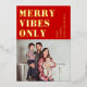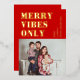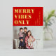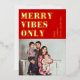 This trendy red holiday card showcases the fun "Merry vibes only" text on the front. Add your family name and a personal photo to make it your own. The back is finished in the same rich red colour for a bold and stylish look.