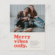 Merry vibes only this holiday season! Send a fun retro-style holiday card with this one-photo design. The throwback type reads "merry vibes only" and it also has room for a custom message, name and year. The back features room for a custom message but can be left blank so you can write a more personal message.