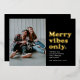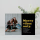 Merry vibes only this holiday season! Send a fun retro-style holiday greetings with this unique one vertical photo Christmas card design. The throwback type reads "merry vibes only" in foil and it also has room for a custom message, name and year. The coordinating back has a distressed texture to complete the vintage look. This Christmas photo card in its chic black and gold is sure to spread cheer to friends and family and works with a variety of photos.