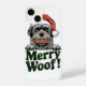 This design features a shaggy black and white dog, possibly a Schnauzer, wearing a festive Santa hat. The dog is peeking over a border with the text “Merry Woof!” written in green below it. The detailed fur texture and expressive eyes of the dog add to the charm, while the overall design conveys a festive holiday theme, combining elements of Christmas cheer with pet cuteness