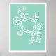 Vintage chainrings and sprockets in white, meshing on a light teal background, in the traditional Bianchi colours.