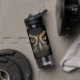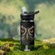 Add a touch of nature to your workouts and walks with this wildlife-inspired hydration bottle, which features the golden gaze of a Spectacled Owl, vignetted on a black background.