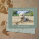 Miss you card to share digitally. Miss you so much card with custom text. A white poodle is covered with sand and looks forlornly at a ball on the beach. Along the top, the text is, “Without you, I’m a real mess”. Beneath the image another line of text reads, “Miss you so much”. Personalise the text as you like, and change the photo. Sage green colour with paw print pattern on reverse.