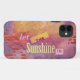 The wall, in the original design by ZoeSPEAK on this inspirational iPhone 11 Case, is an old red brick wall with a mural on stucco which is crumbling away. The mural is a picture of puffy clouds in the sunset, all pink and bright yellow at the top against a deep blue sky. The message is to let the sunshine in.