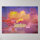 The wall, in the original artwork by ZoeSPEAK on this inspirational Poster, is an old red brick wall with a mural on stucco which is crumbling away. The mural is a picture of puffy clouds in the sunset, all pink and bright yellow at the top against a deep blue sky. The message is to let the sunshine in.