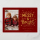 Celebrate the reality of a busy holiday season with this hilariously honest and bright photo card! The phrase "Messy & Bright" is rendered in a playful, string-light-style script and surrounded by fun sparkles, all gorgeously illuminated in premium gold foil against the deep burgundy red background. Your favorite family photo is elegantly framed on the left, ensuring this fun, relatable, and vibrant card brings smiles to everyone who receives it.
