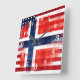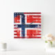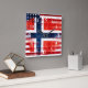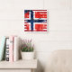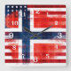 Cool square wall clock with a Norwegian American fusion design featuring a print of the American flag and the Norwegian Flag merged together in a messy brush stroke design, with white numbers.