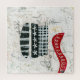 A playful collage mixed media piece in acrylic, pencil and crayon. It features a messy pencil scribbled white background with pops of colour from the layers below, then black and white elements in chequerboard, flowers and stripes. It finishes with a swirly, loopy red accent near the top.