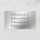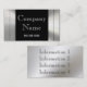A metallic frame border in smooth silver stainless steel look chrome on the front of the card with a dynamic black background gives a bold, unique 3d look professional-looking business card. Easily customise with your own information. Use the matching silver grey stylish font shown or easily change the font style and colour. Also, you can easily change the black colour background to any colour. Just click on "Customise it". A unique looking card, especially great for industrial, skilled trades in construction and building occupations. More information can be put on the back as well on the smooth metal background. A strong business card that stands out from the rest. Realistically printed, not real metal.