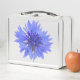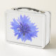 Metal blue lunchbox with blue cornflower design set against a white background- close up photography