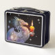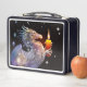 A black metal lunchbox with drawings of happy dragons that are admiring candles, by Melody Pena.