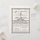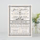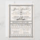 This metallic black and gold invitation with a subtle floral damask background has a vintage, old fashioned feel with old-timey letter design, including elaborate script elements, a decorative banner, stars and a swirly ampersand. The fancy invitation is inspired by both vintage design and stylish posters. The text reads: "You're Invited to the wedding of [customisable name] & [customisable name] [customisable date] [customisable time]. Please Join Us for an Unforgettable Celebration". Further personalise the invitation with the wedding ceremony and reception information and address, each in their own box with dotted border.