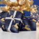 A festive and colourful blue and gold Christmas wrapping paper with a pattern of golden reindeer on a brilliant, blue background. Perfect for all your holiday gift wrapping needs this festive season. Get yours today!