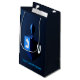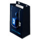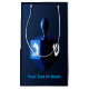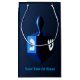 A modernistic, metallic blue dreidel against a dark, night-like background. Two of the Hebrew letters found on a dreidel, nun and shin, glow brightly. Add your own text.