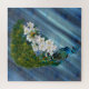 Bouquet of fragrant white-Frangipani flowers and 2 Peacocks on a chic emerald green silk textured peacock pattern background