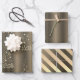 An elegant set of Christmas wrapping paper featuring a metallic bronze and gold diagonal striped sheet, a bronze gradient sheet, and a pattern of Christmas trees made of snowflakes on a bronze gradient background. This very contemporary, decorative set of wrapping paper will be sure to add a sophisticated and stylish touch to any gift.