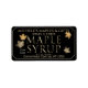 This maple syrup label can be customised with your business name, address and maple syrup volume in ounces and milliliters. There is a handy list of common container sizes with their conversions in the form field where you fill in your information. Black background with gold text and border. For a special touch, the word “maple syrup” has a gold gradient. Four dainty gold and yellowish-orange leaves are scattered on the black background as though they were falling from a sugar maple in autumn.