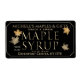 This maple syrup label can be customised with your business name, address and maple syrup volume in ounces and milliliters. There is a handy list of common container sizes with their conversions in the form field where you fill in your information. Black background with gold text and border. For a special touch, the word “maple syrup” has a gold gradient. Four dainty gold and yellowish-orange leaves are scattered on the black background as though they were falling from a sugar maple in autumn.