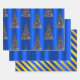 A colourful gold and blue set of Christmas wrapping paper featuring a blue and gold diagonal striped sheet, a metallic blue sheet, and a pattern of gold Christmas trees on a metallic blue background. This elegant and decorative set of wrapping paper will make any gift look great!