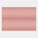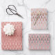 This assortment of holiday wrapping paper sheets features simulated metallic glitter faux foil ornate christmas pine tree silhouettes in rose gold and platinum silver scattered over a beautiful solid tones of mauve, rose quartz pink, and platinum grey