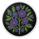 The design highlights a Métis beadwork–inspired design of clustered purple Sweet William blossoms with pink centres and leafy green stems. The round floral sprays stand out against a deep black background, creating the look of traditional bead artistry transformed into a functional home accent.