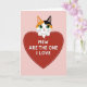 This greeting card shows a calico cat peeking out from behind a big deep red heart in the center. The cat has a white face with orange and black patches, and bright green eyes that look sweet and a little curious. The heart is outlined with white dashed stitches, like it was sewn by hand, which adds a cozy, caring feel. Inside the heart, the message “MEW ARE THE ONE I LOVE” is written in white block letters that are easy to read. The text sits right in the middle of the heart, so it’s the first thing you notice. A soft pastel pink background fills the rest of the card and keeps the focus on the cat and the message. It’s a simple, warm design that fits romance or friendship perfectly ❤️💌🍫.